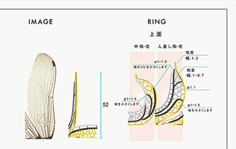 石の大きさやリングサイズなど予め寸法を計測、指定した上でデザインを描くので、イメージ違いが起こりづらいです。