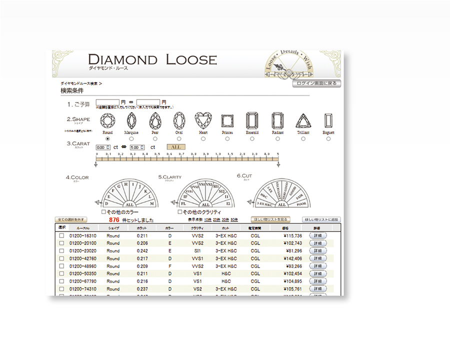 検索ができ、ご希望のダイヤモンドルースが素早く見つかります。