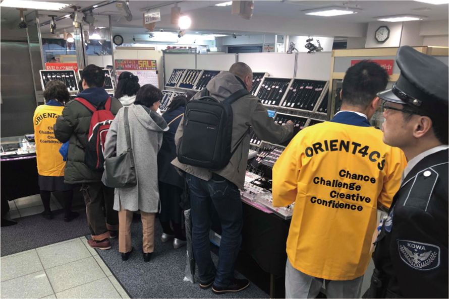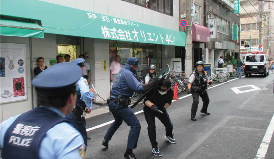 弊社店頭に強盗が現れたという想定で、上野警察署の方に本物さながらの強盗を演じて頂きました。(写真上)