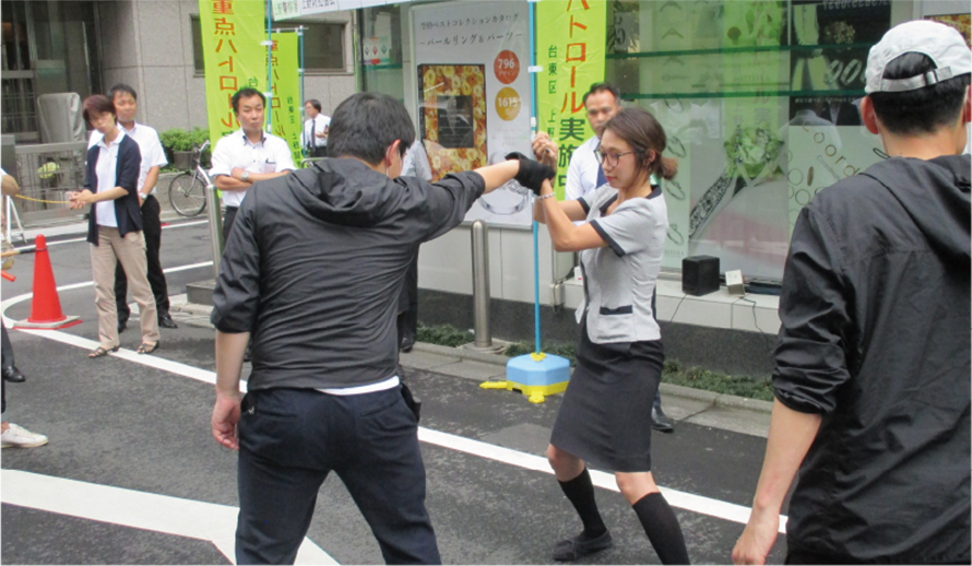合わせて、カラーボールを効果的に使う方法や、犯人に手首を掴まれた時の護身術(写真右下)を体験しながら、学びました。